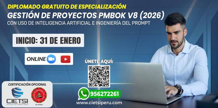 Especialízate gratis en Gestión de Proyectos PMBOK V8 con Inteligencia Artificial. Diplomado virtual 2026 con opción de certificación: CIP, CORLAD, UNT y CIETSI.
