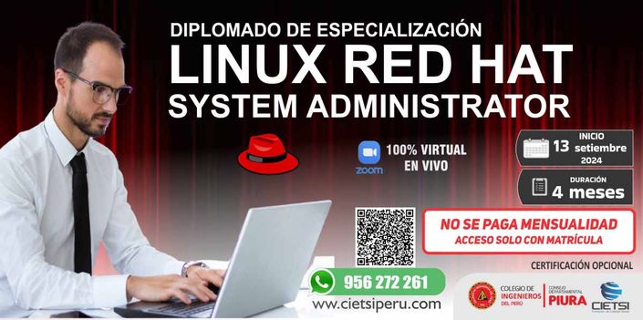Certificación en el PROGRAMA DE ESPECIALIZACIÓN EN LINUX RED HAT SYSTEM ADMINISTRATOR, a nombre del Centro de Altos Estudios CIETSI (360 horas académicas): S/ 250 soles.