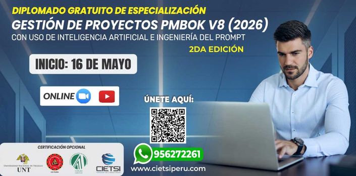 Especialízate gratis en Gestión de Proyectos PMBOK V8 con Inteligencia Artificial. Diplomado virtual 2026 con opción de certificación: CIP, CORLAD, UNT y CIETSI.